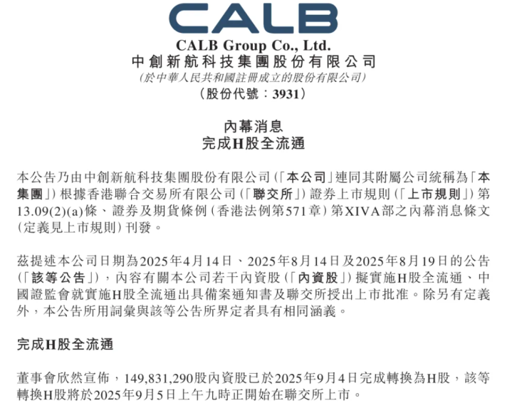 9月4日晚间,中创新航(代码:3931)发布公告称,完成H股全流通。公司董事会宣布149,831,290股内资股已于2025年9月4日完成转换为H股,转换的H股于2025年9月5日上午九时开始在联交所上市。